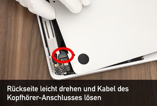 Anschließend legt ihr euer Macbook wieder auf den Tisch und dreht die Alu-Rückseite leicht nach Links um das Flachbandkabel des 3,5″ Klinkenanschlusses zu lösen: