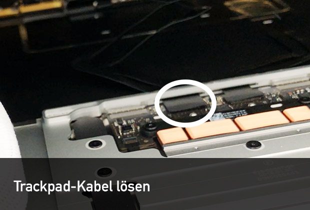 Auf der MacBook-Unterseite müssen zunächst alle 8 Pentalobe-Schrauben entfernt werden. Anschließend müsst ihr kleine Plastikwerkzeuge verwenden, da die Alu-Rückseite in der Gehäuse-Mitte eingeklipst ist. Sobald ihr den Deckel vorsichtig gelöst habt, müsst ihr diesen leicht aufklappen und das erste Flachbandkabel des Trackpad’s lösen: