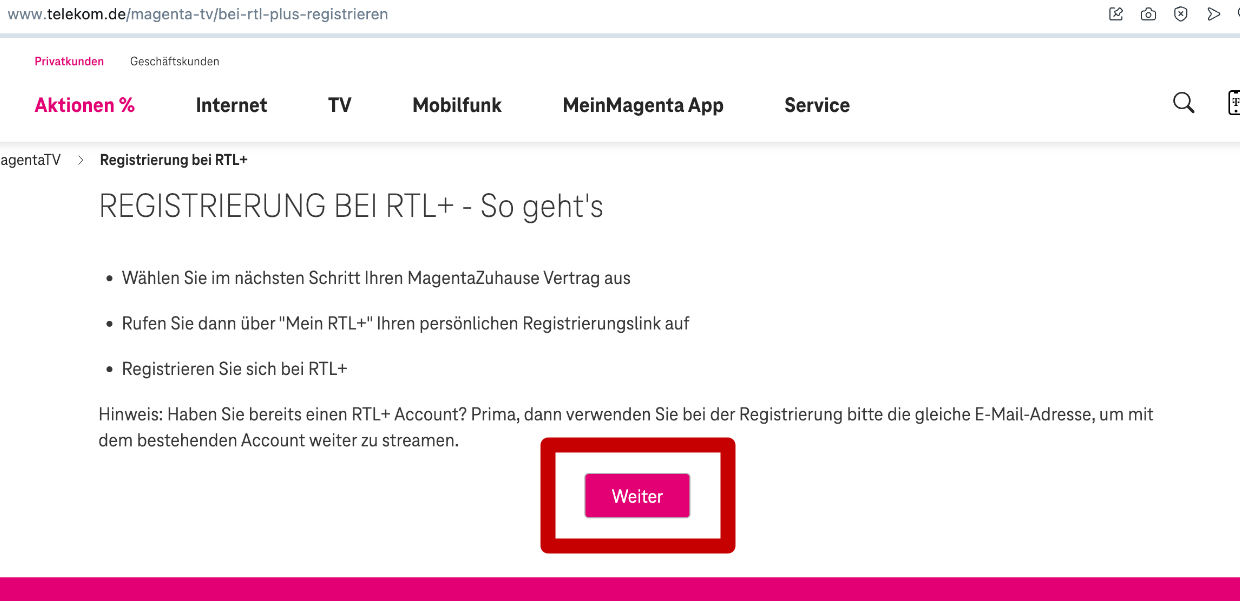 Ihr landet auf einer Infoseite mit dem Titel „REGISTRIERUNG BEI RTL+ – So geht's". Klickt dort auf den Button „Weiter".