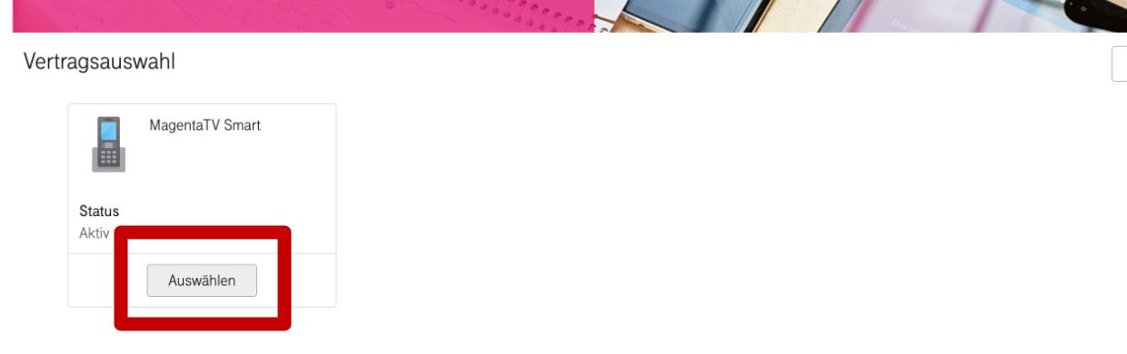 Ihr gelangt nun in die Vertragsübersicht. Sucht dort euren MagentaTV-Tarif heraus und klickt auf "Auswählen".