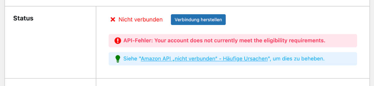 Der AssociateNotEligible-Fehler (HTTP 403) wird von der Amazon Product Advertising API (PA-API 5.0) oder auch der neuen Creators-API zurückgegeben, wenn das verknüpfte Amazon-PartnerNet-Konto die Zugangsvoraussetzungen nicht mehr erfüllt. Er tritt nicht nur beim AAWP-Plugin auf, sondern bei jedem WordPress-Plugin oder Skript, das auf die Amazon PA-API oder die neuere Amazon Creators API zugreift – darunter u. a.: