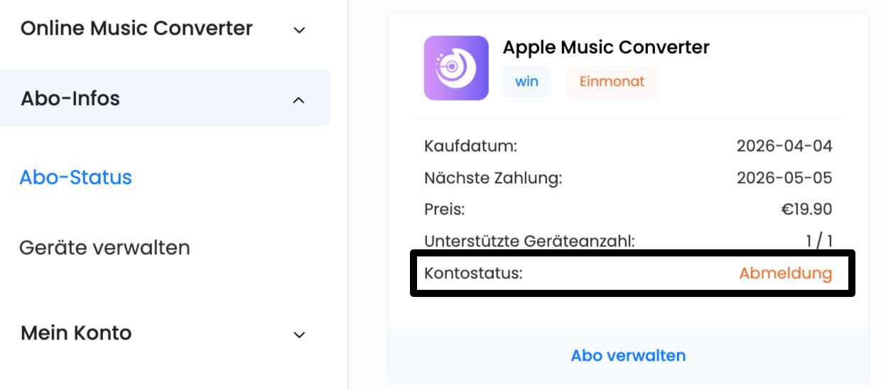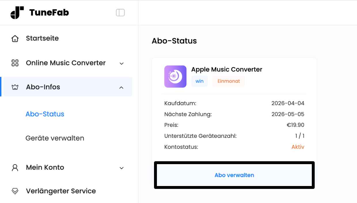 In dieser Anleitung zeigen wir dir Schritt für Schritt, wie du ein bestehendes TuneFab-Abo unkompliziert wieder kündigen kannst. Als Beispiel dient hier ein monatlich abgeschlossenes Abo für den Apple Music Converter.