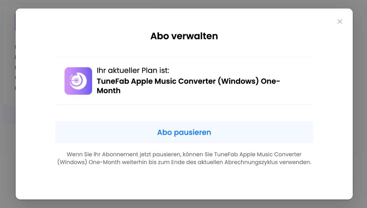 Daraufhin öffnet sich ein Informationsfenster, in diesem Fenster erklärt TuneFab, dass du dein Abo zunächst pausieren kannst. Das bedeutet in der Praxis, dass du zwar die automatische Verlängerung deaktivierst, die Software aber weiterhin bis zum Ende des bereits bezahlten Abrechnungszeitraums nutzen kannst. Dir geht also keine bereits bezahlte Nutzungszeit verloren.