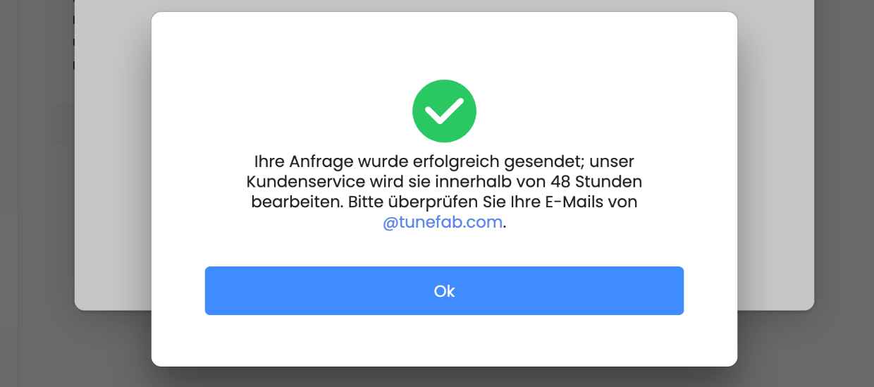 Nachdem du diesen Schritt abgeschlossen hast, ist die Kündigung im Grunde bereits durchgeführt. Dein Feedback wird automatisch an den Kundenservice von TuneFab übermittelt, sodass das Unternehmen die Gründe für Kündigungen besser nachvollziehen kann. Das abschließende Hinweisfenster kannst du einfach mit einem Klick auf „OK“ schließen: