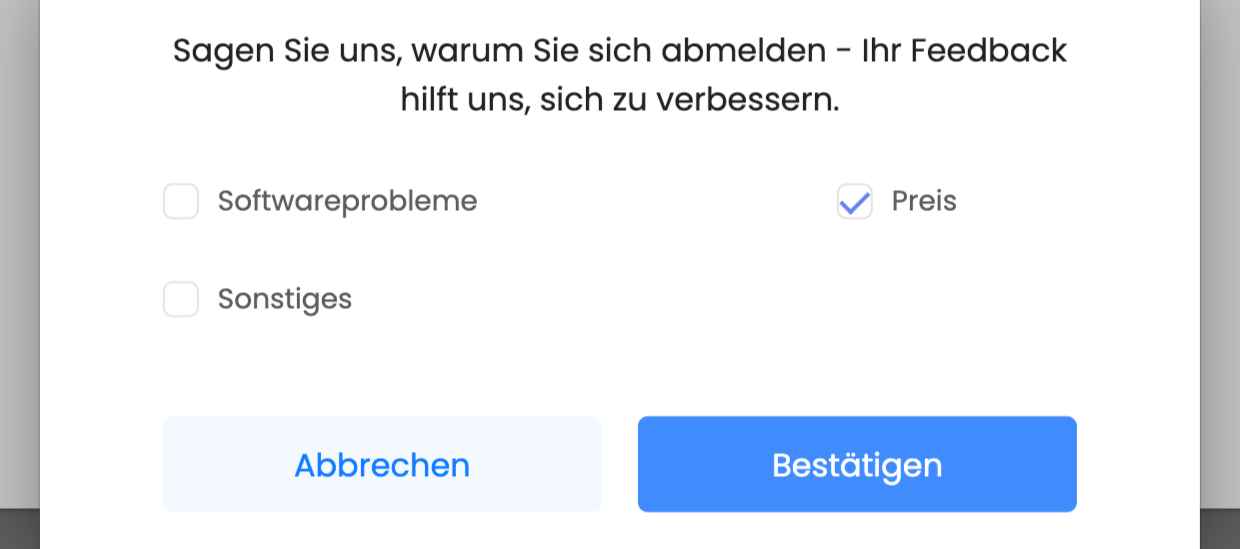 Anschließend wirst du gebeten, ein kurzes Feedback zu geben. TuneFab möchte hier erfahren, aus welchem Grund du dein Abo kündigst. Dir werden mehrere Auswahlmöglichkeiten angezeigt, beispielsweise Probleme mit der Software, der Preis oder auch ein allgemeiner „Sonstiges“-Punkt. Wähle den für dich passenden Grund aus und bestätige deine Auswahl anschließend über den Button „Bestätigen“:
