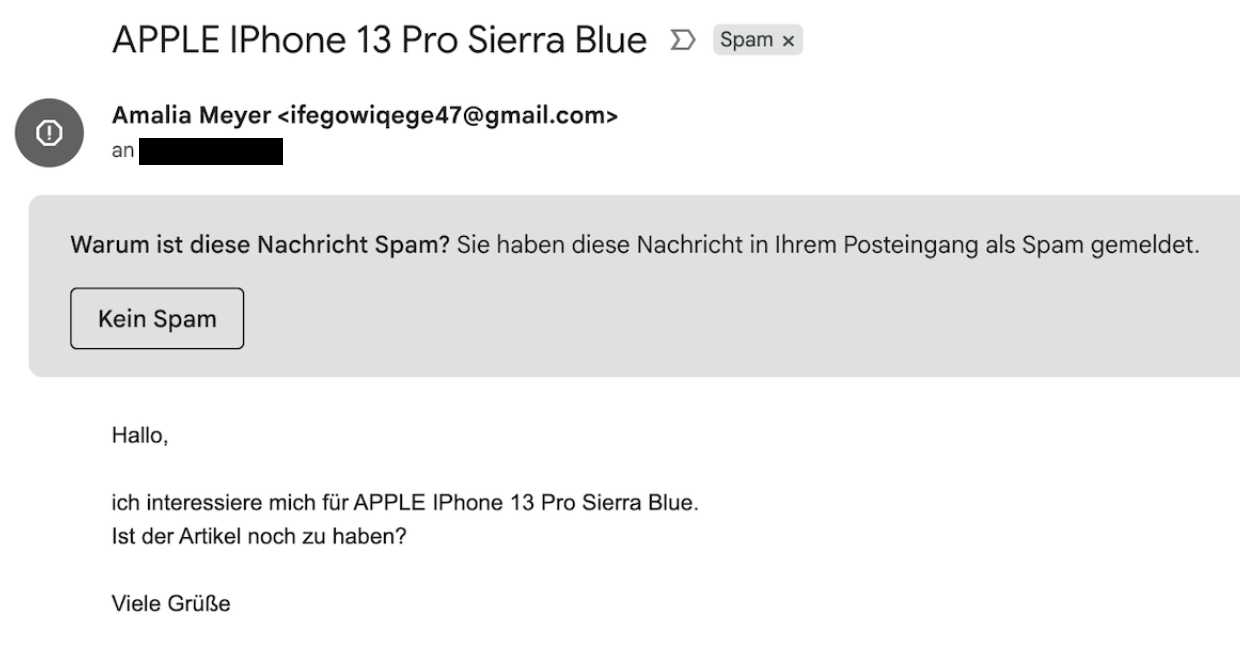 Ein erster Hinweis kann jedoch die Absenderadresse sein, denn hier handelt es sich oft um zufällige Zahlen- oder Buchstabenkombinationen, gefolgt von einem bekannten Freemail-Anbieter wie Gmail, GMX, Web.de und Co. Charakteristisch ist zudem eine abschließende Frage, beispielsweise, ob der Artikel noch verfügbar sei. Der Betrüger ist in der Regel auf eine Antwort angewiesen, um festzustellen, ob die angeschriebene E-Mail-Adresse tatsächlich existiert.