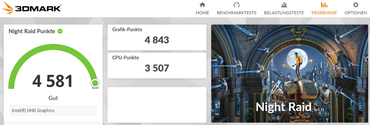 Im 3DMark „Night Raid“ Test erreicht das Mini-Convertible eine insgesamt Punktzahl von 4581, der Grafik-Score liegt dort bei 4843 und die CPU erreicht 3507 Punkte. In der Praxis bedeutet das, dass einfache 2D-Spiele und eventuell Emulatoren älterer Konsolen oder kleinere Programme flüssig laufen, doch moderne 3D-Games oder Rendering-Anwendungen klar außerhalb der Zielgruppe bleiben.