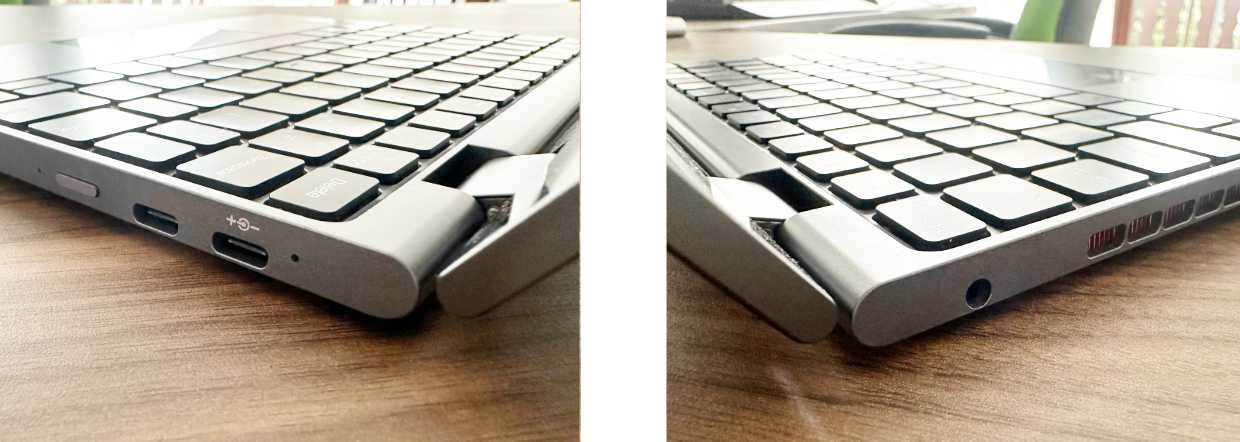 Anschlusstechnisch ist das Gerät allerdings etwas mau bestückt und bietet lediglich zwei USB-C Anschlüsse sowie einen Kopfhöreranschluss, außerdem ist der Einschalter des Geräts auch etwas ungewöhnlich unterhalb der USB-C Anschlüsse positioniert – dies dürfte allerdings mit Hinblick auf die Tablet-Funktion durchaus konstruktionstechnisch seinen Sinn haben.