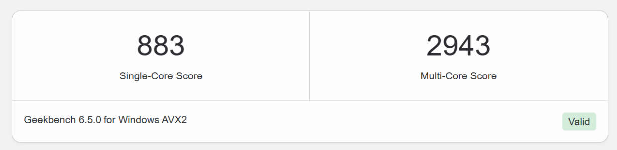 Im Vergleich zu Mini-PC’s fällt die effektiv nutzbare Leistung des N100-Prozessors deutlich geringer aus, da schlicht die Kühllösung in dem Notebook nicht mehr zulässt. Daraus abgeleitet ist es auch wenig verwunderlich, dass die typischen Benchmark-Ergebnisse somit etwas schlechter ausfallen. Konkret erreichen wir im Geekbench CPU-Test einen Score von 883 im Single-Core und 2943 Punkte im Multi-Core.
