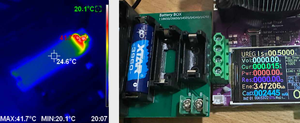 In unserem Kapazitätstest haben wir zwei verschiedene Entlade-Szenarien mit den XTAR 1.5V AA 3960 durchgespielt. Zunächst wurde ein Akku mit leichten 0,5 Ampere entladen, wobei schlussendlich 2445 mAh erreicht wurden – dies liegt leicht unter der Herstellerangabe in Höhe von 2500 mAh, wobei dieser Wert aufgrund der vorhandenen Over-Discharge-Protection wohl nicht komplett erreicht wird. Bei einer starken Belastung mit 2 Ampere konnten wir eine nutzbare Kapazität von 2185 mAh messen – dies war zu erwarten, da hier auch die Wandlungselektronik einiges leisten muss und sich der Pluspol der Zelle auf ca. 40 Grad laut Wärmebildkamera erwärmt.