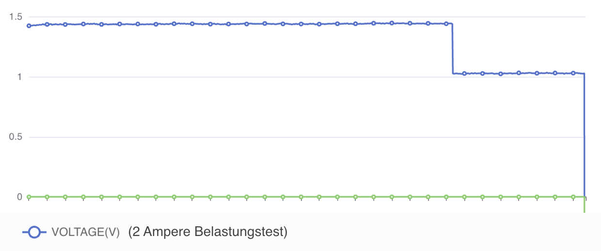 Im Diagramm lässt sich zudem erkennen, dass die Akkus – wie von XTAR beschrieben – nach etwa 90-prozentigem Verbrauch in einen Low-Battery-Modus wechseln. Dabei wird die Spannung von 1,5 Volt auf etwa 1,1 Volt reduziert, um bei Geräten die typische Warnung für eine geringe Batteriekapazität auszulösen. Sind auch die letzten 10 Prozent verbraucht, schaltet sich der XTAR-Akku vollständig ab und senkt die Spannung auf 0 Volt, um Schäden an der Lithium-Zelle zu vermeiden. Eine Tiefentladung findet also nicht statt und schont den Akku.